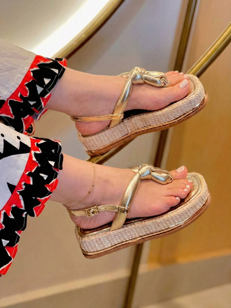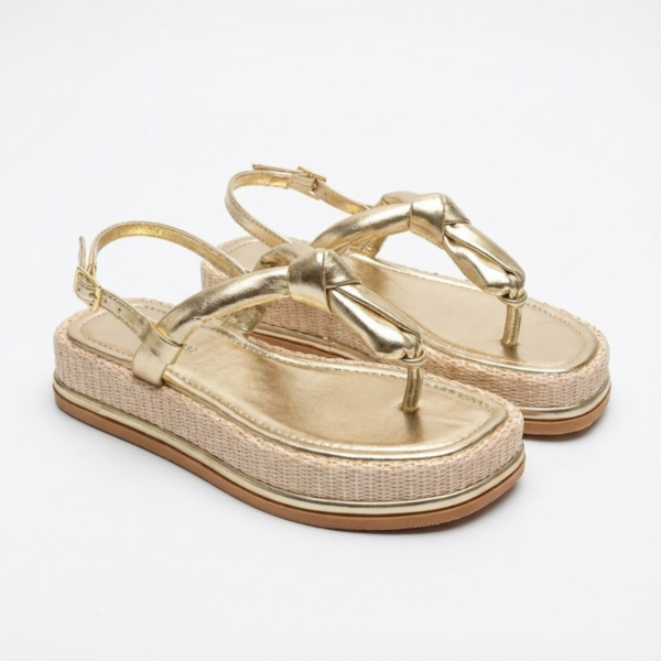 👡 Sandália Plataforma Nó – Sofisticação em Tom Gold